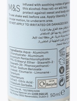 Složení: voda, chlorohydrát hliníku, pentachlorhydrát zirkonia hliníku, PPG-15 stearylether, steareth-2, steareth-20, fenoxyethanol, parfém, benzoan sodný, linalool, kumarin, limonen, extrakt geranium robertianum, kyselina citronová, sorban draselný.